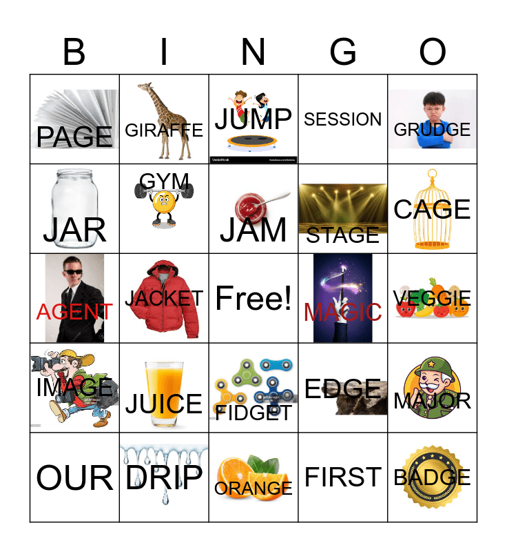 This bingo card has 21 images, a free space and 24 words: JUICE, DRIP, JAM, OUR, GRUDGE, PAGE, JAR, GIRAFFE, MAGIC, FIDGET, STAGE, AGENT, EDGE, MAJOR, GYM, FIRST, VEGGIE, JUMP, CAGE, JACKET, BADGE, IMAGE, SESSION and ORANGE.