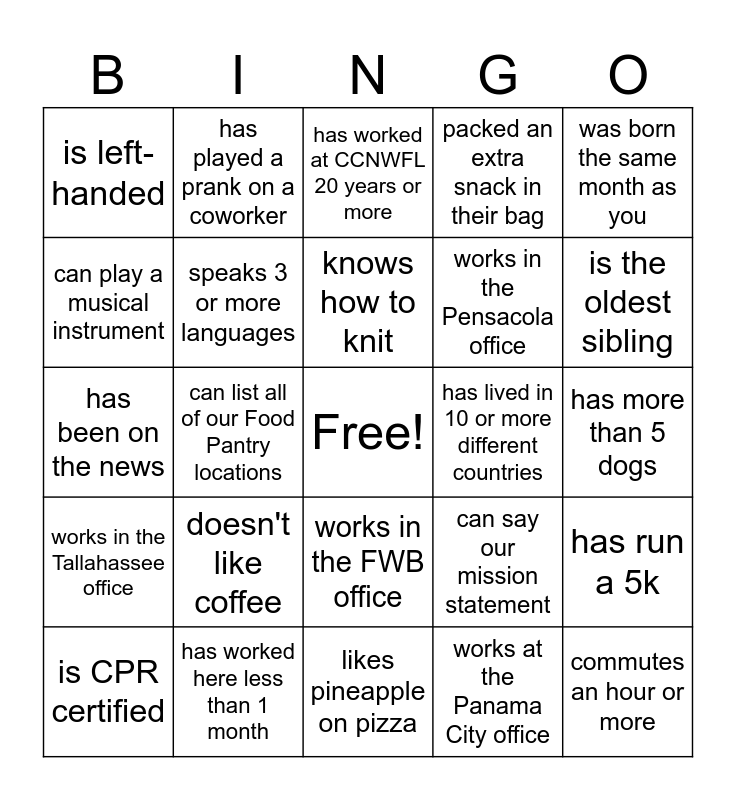 This bingo card has a free space and 24 words: doesn't like coffee, has worked here less than 1 month, knows how to knit, is CPR certified, was born the same month as you, is left-handed, can play a musical instrument, has played a prank on a coworker, has lived in 10 or more different countries, works in the FWB office, works in the Pensacola office, has been on the news, can say our mission statement, has run a 5k, speaks 3 or more languages, works at the Panama City office, has more than 5 dogs, has worked at CCNWFL 20 years or more, is the oldest sibling, can list all of our Food Pantry locations, commutes an hour or more, works in the Tallahassee office, packed an extra snack in their bag and likes pineapple on pizza.