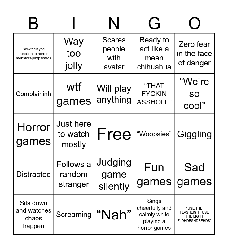This bingo card has a free space and 24 words: Sits down and watches chaos happen, Follows a random stranger, Will play anything, Sings cheerfully and calmly while playing a horror games, Zero fear in the face of danger, Slow/delayed reaction to horror monsters/jumpscares, Way too jolly, Scares people with avatar, “Woopsies”, Giggling, Horror games, wtf games, Fun games, Sad games, Complaininh, Screaming, “Nah”, Ready to act like a mean chihuahua, “We’re so cool”, Distracted, Just here to watch mostly, Judging game silently, “THAT FYCKIN ASSHOLE” and “USE THE FLASHLIGHT USE THE LIGHT FJDHDBSHDBFHDS”.