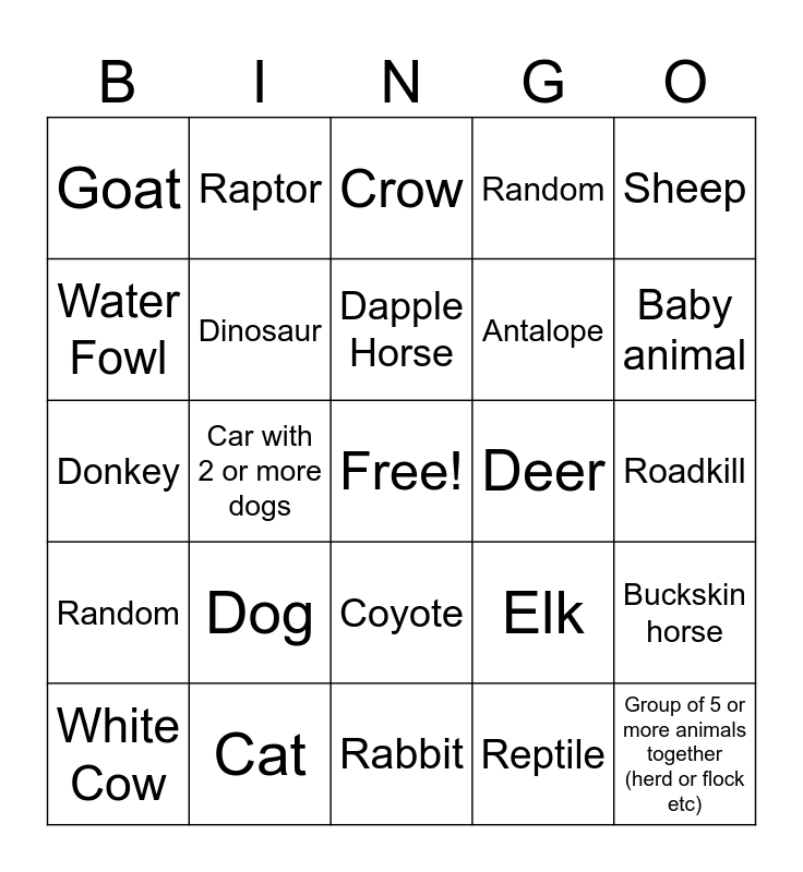 This bingo card has a free space and 24 words: Dog, Cat, Dapple Horse, White Cow, Sheep, Goat, Water Fowl, Raptor, Deer, Coyote, Antalope, Donkey, Elk, Buckskin horse, Dinosaur, Reptile, Roadkill, Crow, Baby animal, Car with 2 or more dogs, Group of 5 or more animals together (herd or flock etc), Random, Random and Rabbit.