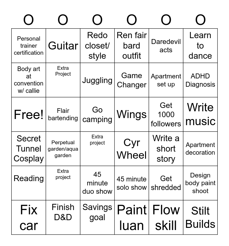 This bingo card has 36 words: 45 minute solo show, 45 minute duo show, Paint luan, Body art at convention w/ callie, Secret Tunnel Cosplay, Wings, Extra Project, Savings goal, Daredevil acts, Get shredded, ADHD Diagnosis, Ren fair bard outfit, Design body paint shoot, Flair bartending, Game Changer, Personal trainer certification, Reading, Get 1000 followers, Free!, Redo closet/ style, Go camping, Perpetual garden/aqua garden, Cyr Wheel, Extra project, Write a short story, Guitar, Apartment set up, Finish D&D, Juggling, Learn to dance, Stilt Builds, Fix car, Apartment decoration, Write music, Extra project and Flow skill.