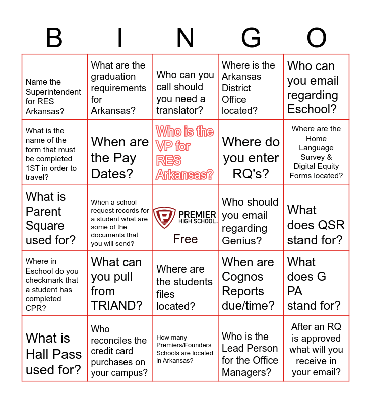 This bingo card has a free space and 24 words: What is Hall Pass used for?, What can you pull from TRIAND?, Who is the VP for RES Arkansas?, Who is the Lead Person for the Office Managers?, Who can you email regarding Eschool?, Name the Superintendent for RES Arkansas?, What are the graduation requirements for Arkansas?, Who can you call should you need a translator?, Who should you email regarding Genius?, What does QSR stand for?, What is Parent Square used for?, When are the Pay Dates?, When are Cognos Reports due/time?, What does GPA stand for?, What is the name of the form that must be completed 1ST in order to travel?, Who reconciles the credit card purchases on your campus?, How many Premiers/Founders Schools are located in Arkansas?, Where is the Arkansas District Office located?, Where are the Home Language Survey & Digital Equity Forms located?, Where in Eschool do you checkmark that a student has completed CPR?, When a school request records for a student what are some of the documents that you will send?, Where are the students files located?, Where do you enter RQ's? and After an RQ is approved what will you receive in your email?.