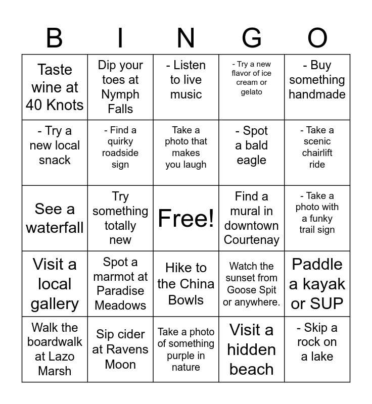 This bingo card has a free space and 24 words: Spot a marmot at Paradise Meadows, Sip cider at Ravens Moon, Take a photo that makes you laugh, Walk the boardwalk at Lazo Marsh, - Buy something handmade, Taste wine at 40 Knots, - Try a new local snack, Dip your toes at Nymph Falls, Find a mural in downtown Courtenay, Hike to the China Bowls, - Spot a bald eagle, See a waterfall, Watch the sunset from Goose Spit or anywhere., Paddle a kayak or SUP, - Find a quirky roadside sign, Visit a hidden beach, - Take a photo with a funky trail sign, - Listen to live music, - Take a scenic chairlift ride, Try something totally new, - Skip a rock on a lake, Visit a local gallery, - Try a new flavor of ice cream or gelato and Take a photo of something purple in nature.