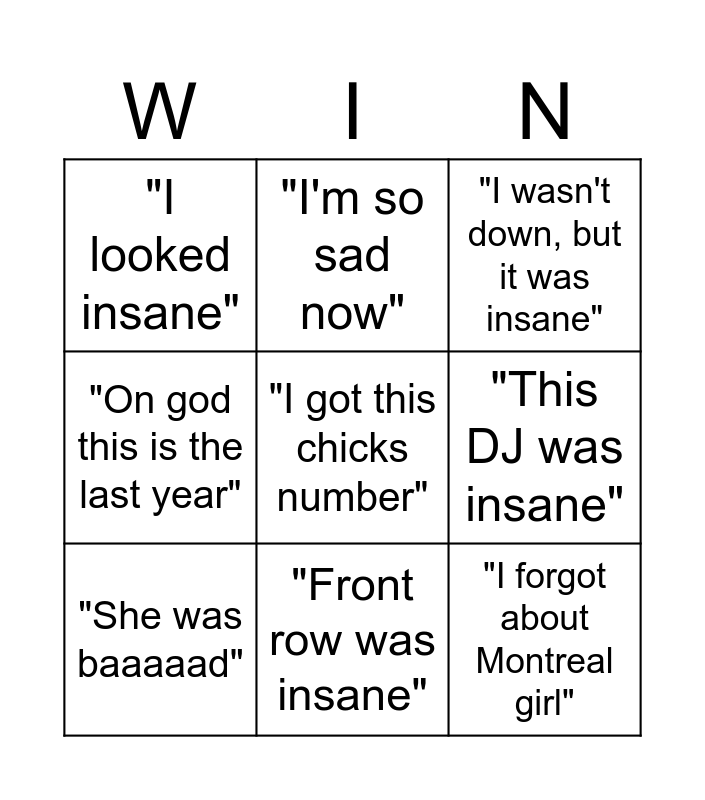 This bingo card has a free space and 8 words: "This DJ was insane", "I wasn't down, but it was insane", "I'm so sad now", "She was baaaaad", "I looked insane", "I forgot about Montreal girl", "On god this is the last year" and "Front row was insane".