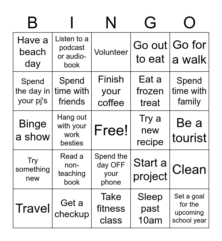 This bingo card has a free space and 25 words: Read a non-teaching book, Take fitness class, Finish your coffee, Travel, Go for a walk, Have a beach day, Spend the day in your pj's, Listen to a podcast or audio-book, Try a new recipe, Spend the day OFF your phone, Eat a frozen treat, Binge a show, Start a project, Clean, Spend time with friends, Have a summer drink, Be a tourist, Volunteer, Spend time with family, Hang out with your work besties, Set a goal for the upcoming school year, Get a checkup, Try something new, Go out to eat and Sleep past 10am.