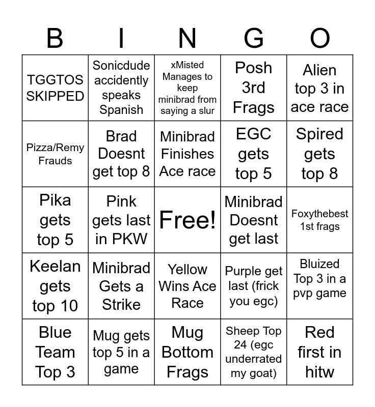This bingo card has a free space and 24 words: Minibrad Gets a Strike, Mug gets top 5 in a game, Minibrad Finishes Ace race, Blue Team Top 3, Alien top 3 in ace race, TGGTOS SKIPPED, Pizza/Remy Frauds, Sonicdude accidently speaks Spanish, Minibrad Doesnt get last, Yellow Wins Ace Race, EGC gets top 5, Pika gets top 5, Purple get last (frick you egc), Bluized Top 3 in a pvp game, Brad Doesnt get top 8, Sheep Top 24 (egc underrated my goat), Foxythebest 1st frags, xMisted Manages to keep minibrad from saying a slur, Spired gets top 8, Pink gets last in PKW, Red first in hitw, Keelan gets top 10, Posh 3rd Frags and Mug Bottom Frags.
