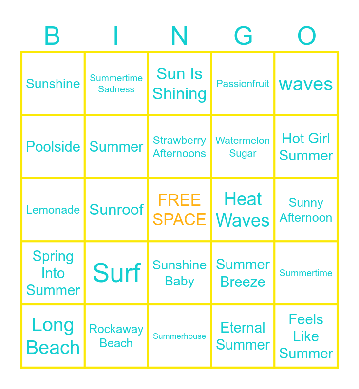 This bingo card has a free space and 24 words: Long Beach, Surf, Strawberry Afternoons, Eternal Summer, waves, Sunshine, Summertime Sadness, Sun Is Shining, Heat Waves, Sunny Afternoon, Lemonade, Summer, Summer Breeze, Summertime, Poolside, Rockaway Beach, Summerhouse, Passionfruit, Hot Girl Summer, Spring Into Summer, Sunroof, Sunshine Baby, Watermelon Sugar and Feels Like Summer.