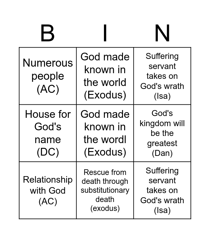 ⚠ This card has duplicate items: Blessing (AC) (2), Numerous people (AC) (2), Place (AC) (2), Relationship with God (AC) (2), Glory as God's character revealed (Exodus) (2), God dwelling with his people (Exodus) (2), Obedient king (DC) (2), Eternal ruling king (DC) (2), House for God's name (DC) (2), Sins forgiven (NC) (2), New hearts (NC) (2), God's kingdom will be the greatest (Dan) (2), New life (Ezk) (2), New creation (Ezk/Isa) (2), Suffering servant takes on God's wrath (Isa) (2), Earth full of God's glory (Gen) (2)