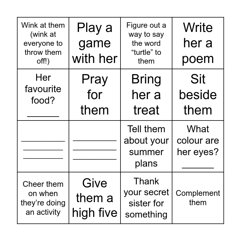 This bingo card has 60 words: Sing them a song/lullaby, Put a gift in their bin, Make them laugh, Complement them, Find out something new about them ___________, Write her name with things from nature and leave it there, Bring her a treat, Make her laugh, ___________ __________ __________, Draw her a portrait and put it in her bin, Write her a poem, Nonchalantly Pat her on the back, Pray for them, Write in your journal all the things you love about them, Tell one of your friends what you admire about them, Wink at them (wink at everyone to throw them off!), Cheer them on when they’re doing an activity, Her favourite food? ______, Put a flower on her pillow, Sit beside them, Give them a high five, Figure out a way to say the word “turtle” to them, Make up a word and use it in front of them (ask a leader for help!), Put on an accent while talking to them, Make eye contact for 3 seconds, Find out there crush!, Bring them a drink, Tell them a fun fact about you, __________ __________ __________, __________ ___________ ___________, How many siblings do they have? _______, Figure out a way to say the word “fingernail” to them, What’s her dream place to live? _________, Put a gift in her bin, Play a game with her, What are they doing this summer? ______, Craziest dare they’ve ever done? _______, What colour are her eyes? ______, Put a friendship bracelet in her bin, Tell them about your summer plans, Tell them a spooky story, Tell a leader something you like about your secret sister, Thank your secret sister for something, Find a way to say “please” to her, FREE! (Lucky you), Smile at them, Have a thumb war with them, Do rock paper scissors with them (be creative!! Ask a leader for help!), Give them a thumbs up, Whisper to them (be creative!), Walk beside them, Listen when she’s talking, Journal your secret sister experience, Think about YOUR favourite way to show love, Write a kind note to them, Say “hello” to her, Ask how their day was, Find out when there bday is (you don’t have to ask them), Find something you have in common and Share with a leader the best story that came from this bingo!.