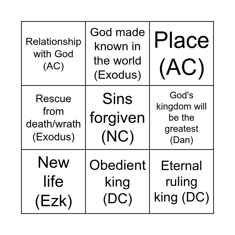 This bingo card has 18 words: Blessing (AC), Numerous people (AC), Place (AC), Relationship with God (AC), Glory as God's character revealed (Exodus), Rescue from death/wrath (Exodus), God dwelling with his people (Exodus), God made known in the world (Exodus), Obedient king (DC), Eternal ruling king (DC), House for God's name (DC), Sins forgiven (NC), New hearts (NC), God's kingdom will be the greatest (Dan), New life (Ezk), New creation (Ezk/Isa), Suffering servant takes on God's wrath (Isa) and Earth full of God's glory (Gen).