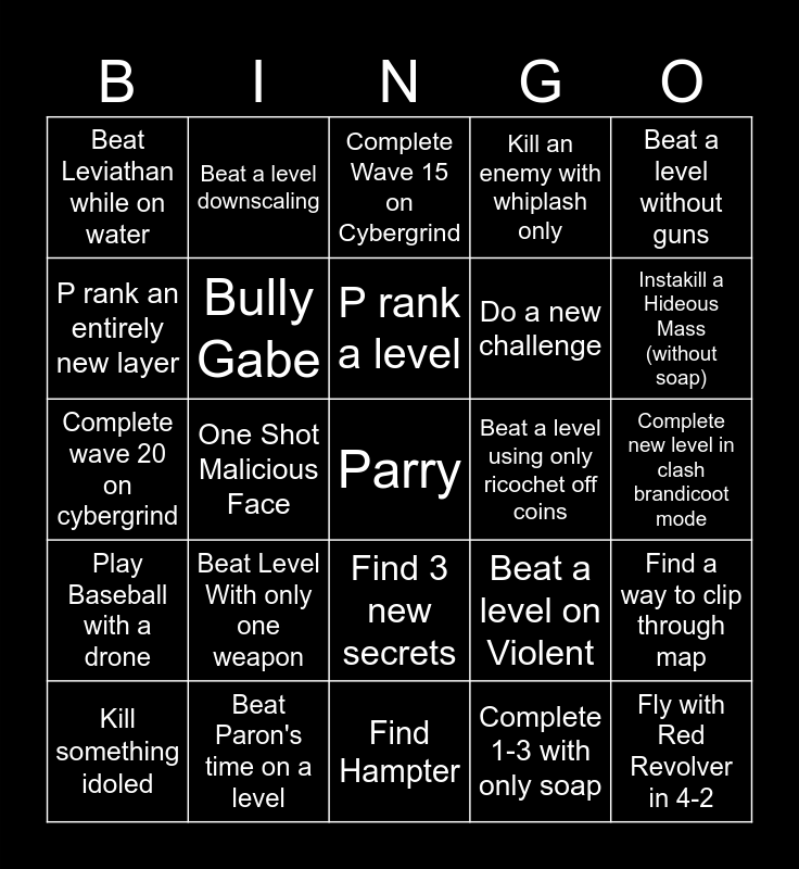 This bingo card has a free space and 24 words: Beat Level With only one weapon, Beat Paron's time on a level, P rank a level, Kill something idoled, Beat a level without guns, Beat Leviathan while on water, P rank an entirely new layer, Beat a level downscaling, Beat a level using only ricochet off coins, Find 3 new secrets, Do a new challenge, Complete wave 20 on cybergrind, Beat a level on Violent, Find a way to clip through map, Bully Gabe, Complete 1-3 with only soap, Complete new level in clash brandicoot mode, Complete Wave 15 on Cybergrind, Instakill a Hideous Mass (without soap), One Shot Malicious Face, Fly with Red Revolver in 4-2, Play Baseball with a drone, Kill an enemy with whiplash only and Find Hampter.