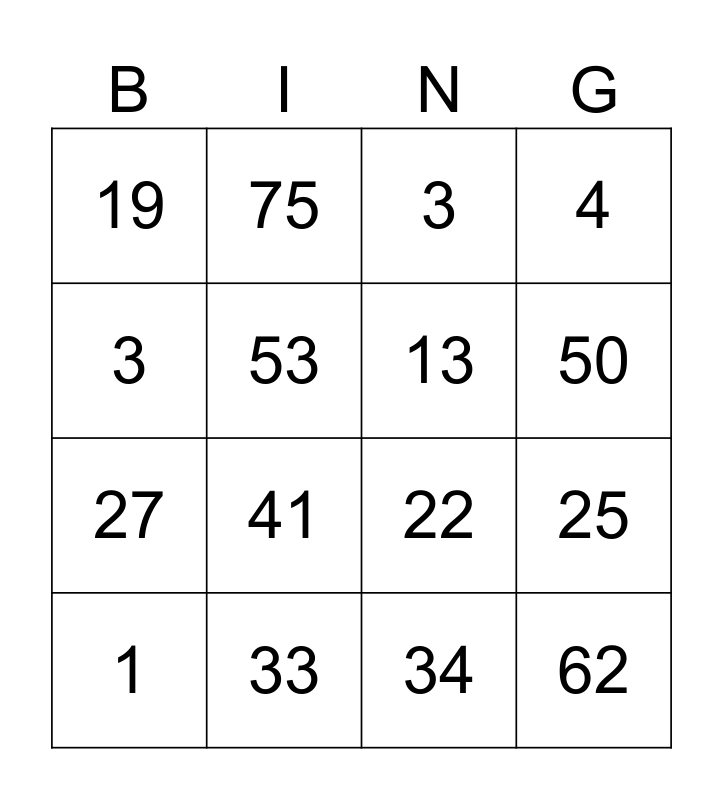 This bingo card has 16 words: 1, 33, 3, 4, 3, 75, 22, 25, 19, 53, 34, 50, 27, 41, 13 and 62.