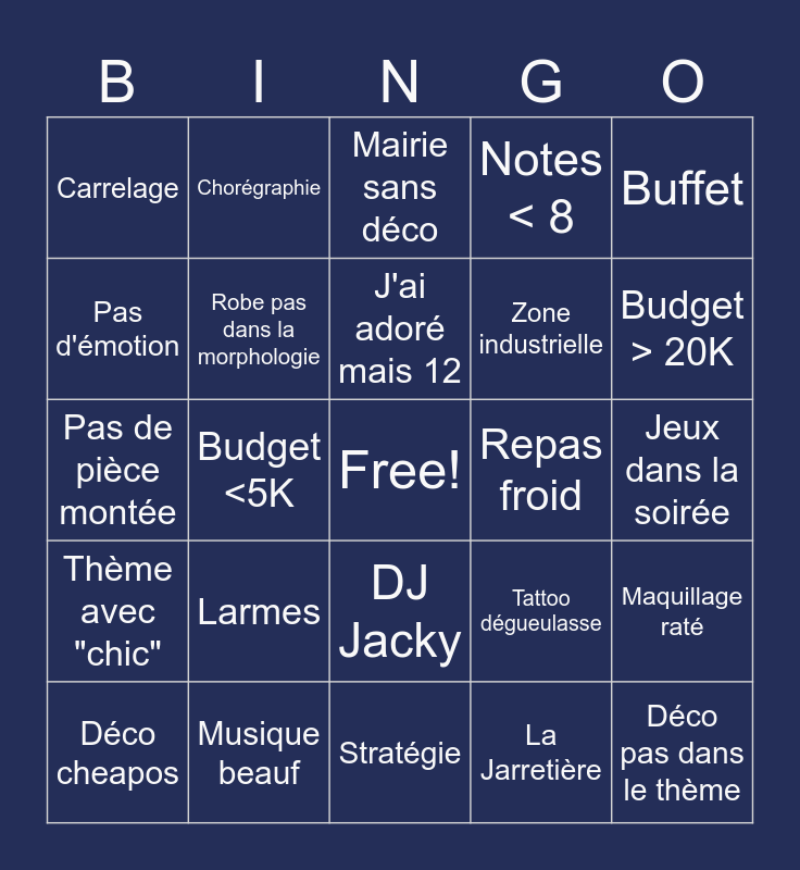 This bingo card has a free space and 24 words: Larmes, Musique beauf, J'ai adoré mais 12, Déco cheapos, Buffet, Carrelage, Pas d'émotion, Chorégraphie, Repas froid, DJ Jacky, Zone industrielle, Pas de pièce montée, Tattoo dégueulasse, Maquillage raté, Robe pas dans la morphologie, La Jarretière, Jeux dans la soirée, Mairie sans déco, Budget > 20K, Budget <5K, Déco pas dans le thème, Thème avec "chic", Notes < 8 and Stratégie.