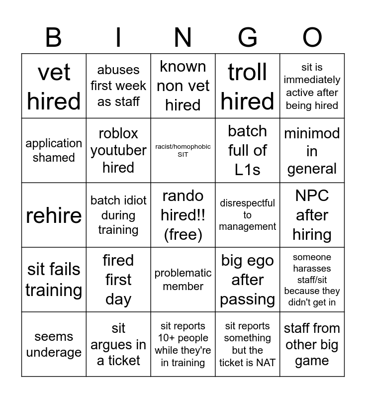 This bingo card has a free space and 24 words: fired first day, sit argues in a ticket, racist/homophobic SIT, seems underage, sit is immediately active after being hired, vet hired, application shamed, abuses first week as staff, disrespectful to management, problematic member, batch full of L1s, rehire, big ego after passing, someone harasses staff/sit because they didn't get in, roblox youtuber hired, sit reports something but the ticket is NAT, NPC after hiring, known non vet hired, minimod in general, batch idiot during training, staff from other big game, sit fails training, troll hired and sit reports 10+ people while they're in training.