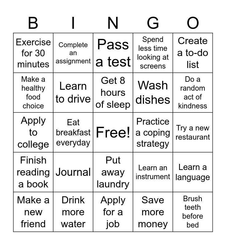This bingo card has a free space and 25 words: Journal, Apply for a job, Get 8 hours of sleep, Make a new friend, Create a to-do list, Exercise for 30 minutes, Make a healthy food choice, Complete an assignment, Practice a coping strategy, Put away laundry, Wash dishes, Apply to college, Learn an instrument, Learn a language, Learn to drive, Hang out with a friend, Try a new restaurant, Pass a test, Do a random act of kindness, Eat breakfast everyday, Brush teeth before bed, Drink more water, Finish reading a book, Spend less time looking at screens and Save more money.