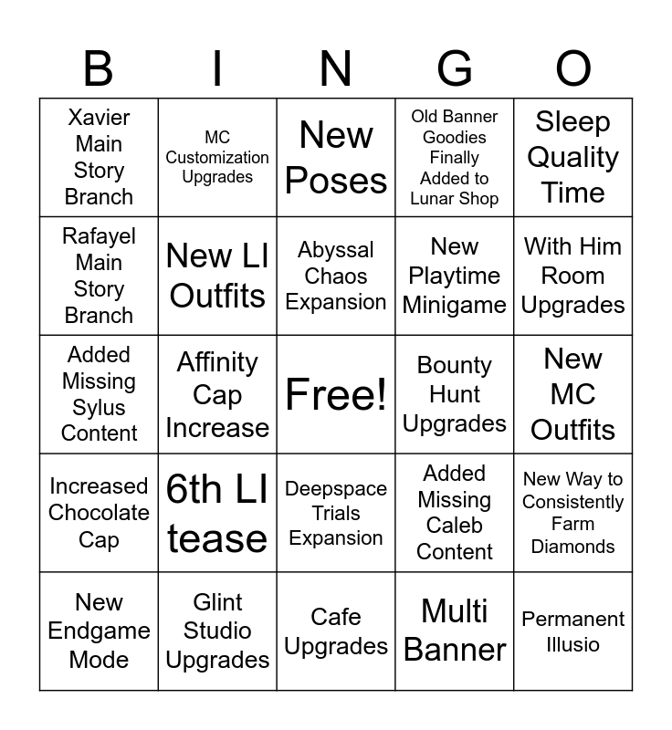 This bingo card has a free space and 24 words: 6th LI tease, Glint Studio Upgrades, Abyssal Chaos Expansion, New Endgame Mode, Sleep Quality Time, Xavier Main Story Branch, Rafayel Main Story Branch, MC Customization Upgrades, Bounty Hunt Upgrades, Deepspace Trials Expansion, New Playtime Minigame, Added Missing Sylus Content, Added Missing Caleb Content, New Way to Consistently Farm Diamonds, New LI Outfits, Multi Banner, New MC Outfits, New Poses, With Him Room Upgrades, Affinity Cap Increase, Permanent Illusio, Increased Chocolate Cap, Old Banner Goodies Finally Added to Lunar Shop and Cafe Upgrades.