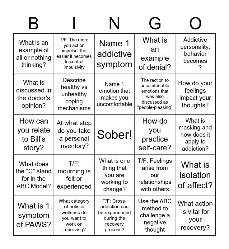 This bingo card has a free space and 24 words: T/F: mourning is felt or experienced, What category of holistic wellness do you want to work on improving?, Name 1 emotion that makes you uncomfortable, What is 1 symptom of PAWS?, Addictive personality: behavior becomes ___?, What is an example of all or nothing thinking?, What is discussed in the doctor's opinion?, T/F: The more you act on impulse, the easier it becomes to control impulsivity, How do you practice self-care?, What is one thing that you are working to change?, The rection to uncomfortable emotions that was also discussed as "people-pleasing", How can you relate to Bill's story?, T/F: Feelings arise from our relationships with others, What is isolation of affect?, Describe healthy vs unhealthy coping mechanisms, Use the ABC method to challenge a negative thought, What is masking and how does it apply to addiction?, Name 1 addictive symptom, How do your feelings impact your thoughts?, At what step do you take a personal inventory?, What action is vital for your recovery?, What does the "C" stand for in the ABC Model?, What is an example of denial? and T/F: Cross-addiction can be experienced during the recovery process?.
