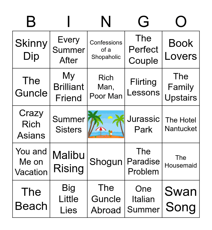 This bingo card has a free space and 39 words: Jaws, The Godfather, Beach Read, My Brilliant Friend, The Beach, Shogun, Rich Man, Poor Man, People We Meet on Vacation, Book Lovers, You and Me on Vacation, Summer Sisters, The Perfect Couple, Swan Song, The Hotel Nantucket, Jurassic Park, Malibu Rising, Just for the Summer, Skinny Dip, This Summer will be Different, The Paradise Problem, The Guncle, The Guncle Abroad, Flirting Lessons, The Family Upstairs, The Other Side of Midnight, The Da Vinci Code, That Summer, The Beach House, The Summer of Lost and Found, Every Summer After, The Summer I Turned Pretty, Island Girls, Confessions of a Shopaholic, Big Little Lies, One Italian Summer, The Summer Pact, The Housemaid, Crazy Rich Asians and Summer on the Bluffs.