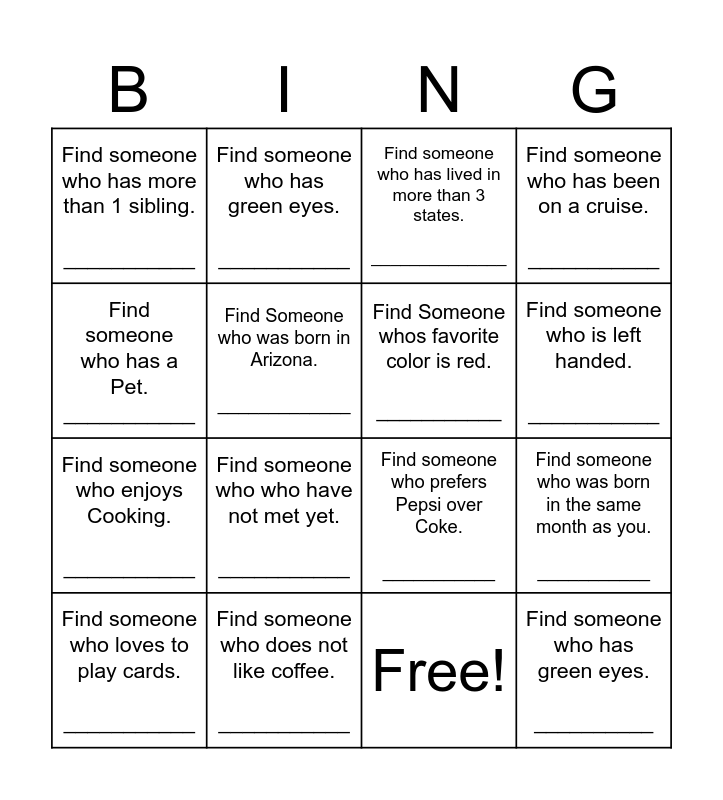 This bingo card has 26 words: Find Someone Who was born in 2010. ____________, Find Someone who plays an instrument. ___________, Find someone who is left handed. ___________, Find Someone Who likes to Sing. ____________, Find someone who has a Pet. ___________, Find someone who has more than 1 sibling. ___________, Find Someone who was born in Arizona. _____________, Find someone who has green eyes. ___________, Free!, Find Someone whos favorite color is red. __________, Find someone who enjoys Cooking. ___________, Find someone who prefers Pepsi over Coke. ___________, Find someone who speaks another language. ____________, Find someone who can paint. __________, Find someone who was born in the same month as you. ___________, Find someone who is shorter than you. _____________, Find someone who has been on a cruise. ___________, Find someone who has green eyes. __________, Find someone who has lived in more than 3 states. ______________, Find someone who loves to play cards. ___________, Find someone who who have not met yet. ___________, Find someone who is an only Child. ___________, Find someone who does not like coffee. ___________, Find someone who has met a famous person. _____________, Find Someone whos favorite color is red. ___________ and Find someone who is wearing a blue shirt. ____________.