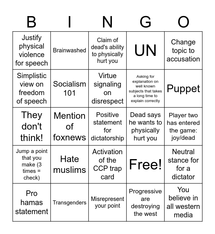 This bingo card has 25 words: Hate muslims, Misrepresent your point, Virtue signaling on disrespect, Pro hamas statement, Change topic to accusation, Justify physical violence for speech, Simplistic view on freedom of speech, Brainwashed, Dead says he wants to physically hurt you, Activation of the CCP trap card, Asking for explanation on well known subjects that takes a long time to explain correctly, They don't think!, Free!, Neutral stance for for a dictator, Socialism 101, You believe in all western media, Player two has entered the game: joy/dead, Claim of dead's ability to physically hurt you, Puppet, Mention of foxnews, Positive statement for dictatorship, Transgenders, Jump a point that you make (3 times = check), UN and Progressive are destroying the west.