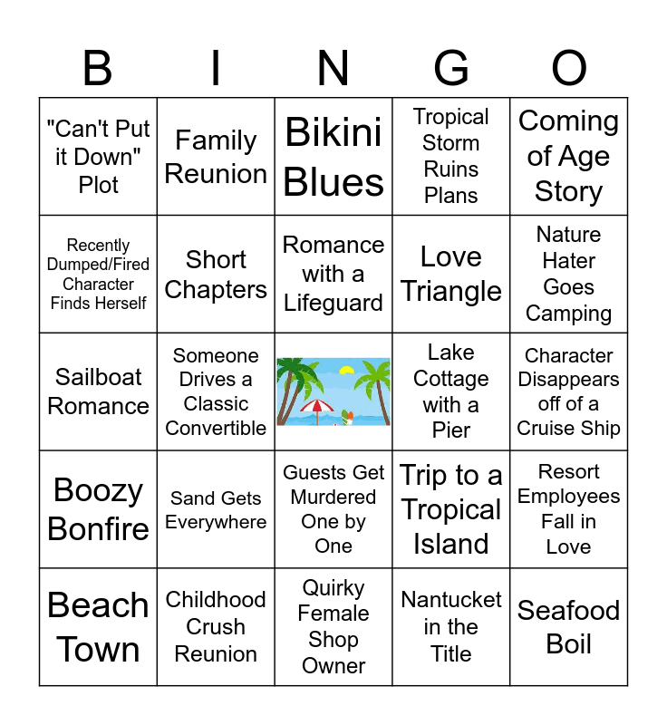This bingo card has a free space and 34 words: Blonde in Big Hat on the Cover, Nantucket in the Title, Sharks!, 4th of July Party, Boozy Bonfire, Short Chapters, Coming of Age Story, Beach Town, Family Reunion, Fish Out of Water, Romance with a Lifeguard, Bikini Blues, Road Trip, Summer Camp Reunion, Lake Cottage with a Pier, Nature Hater Goes Camping, Childhood Crush Reunion, Sailboat Romance, Sand Gets Everywhere, Trip to a Tropical Island, Guests Get Murdered One by One, Beach Wedding, "Can't Put it Down" Plot, Character Disappears off of a Cruise Ship, Quirky Female Shop Owner, Seafood Boil, Tropical Storm Ruins Plans, Historical Family Saga, Love Triangle, Recently Dumped/Fired Character Finds Herself, Left at the Altar, Goes on Honeymoon Alone Anyway, Someone Drives a Classic Convertible, Resort Employees Fall in Love and Dancing Under the Moon or Twinkly Lights.