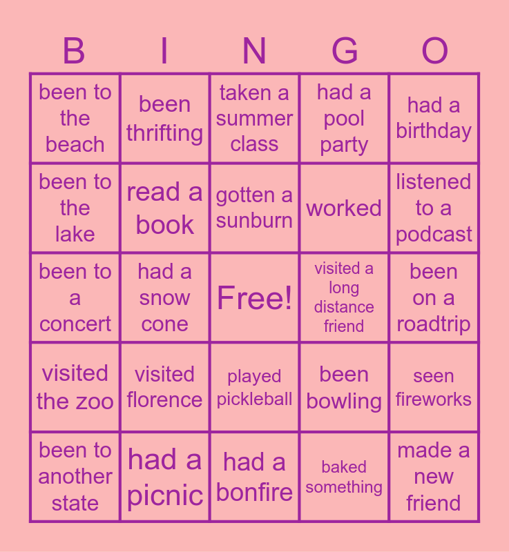 This bingo card has a free space and 24 words: visited florence, had a picnic, gotten a sunburn, been to another state, had a birthday, been to the beach, been to the lake, been thrifting, visited a long distance friend, played pickleball, worked, been to a concert, been bowling, seen fireworks, read a book, baked something, been on a roadtrip, taken a summer class, listened to a podcast, had a snow cone, made a new friend, visited the zoo, had a pool party and had a bonfire.