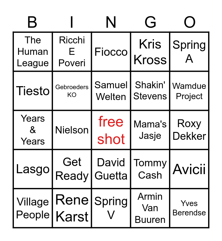 This bingo card has a free space and 24 words: Get Ready, Rene Karst, Samuel Welten, Village People, Spring A, The Human League, Tiesto, Ricchi E Poveri, Mama's Jasje, David Guetta, Shakin' Stevens, Years & Years, Tommy Cash, Avicii, Gebroeders KO, Armin Van Buuren, Roxy Dekker, Fiocco, Wamdue Project, Nielson, Yves Berendse, Lasgo, Kris Kross and Spring V.