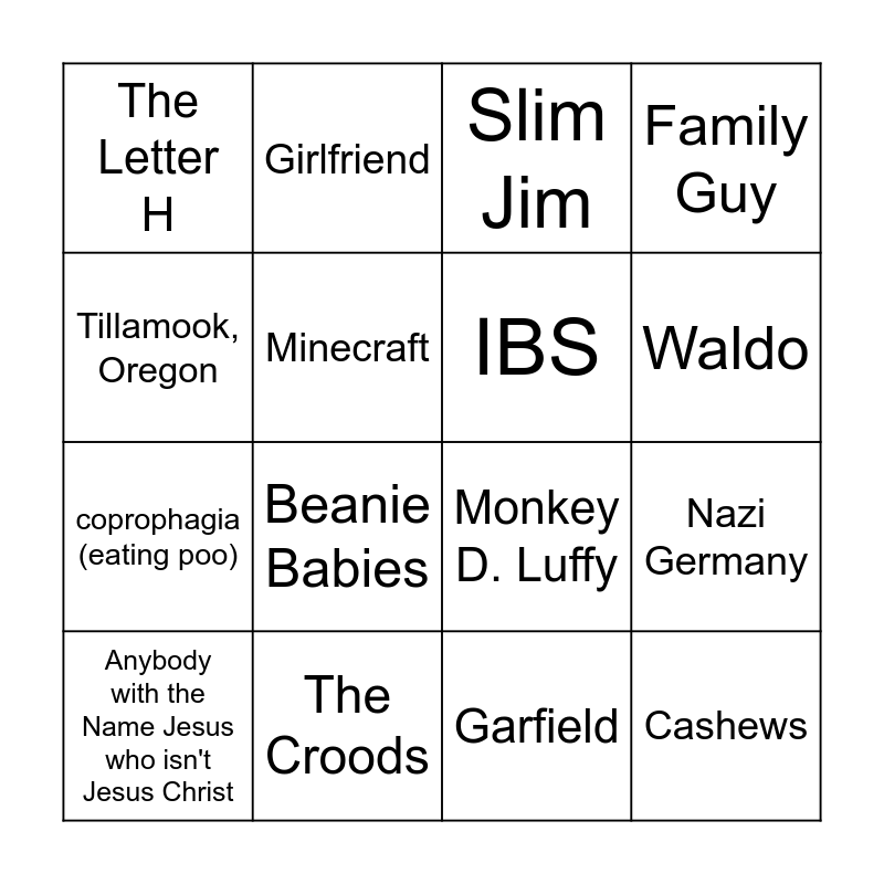 This bingo card has 16 words: The Croods, Nazi Germany, Slim Jim, The Letter H, coprophagia (eating poo), Girlfriend, Monkey D. Luffy, Garfield, Tillamook, Oregon, Minecraft, Anybody with the Name Jesus who isn't Jesus Christ, Family Guy, Beanie Babies, Waldo, IBS and Cashews.