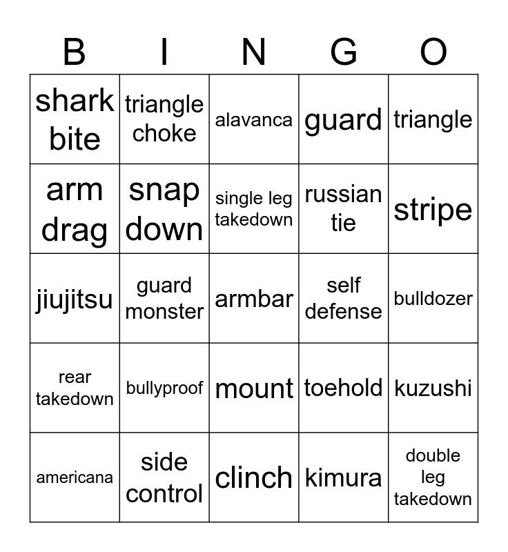 This bingo card has 44 words: Free!, armbar, choke, americana, gracie chandler, kimura, alavanca, helio gracie, triangle, side control, guard, self defense, mount, bullyproof, tap, clinch, tackle the giant, jiujitsu, belt, stripe, triangle choke, back mount, spider kid, shark bite, snake bite, bulldozer, omoplate, heelhook, toehold, rear takedown, osoto gari, kuzushi, base, crocodile control, guard monster, crazy horse, crazy legs, double leg takedown, single leg takedown, arm drag, russian tie, duck under, snap down and upa.