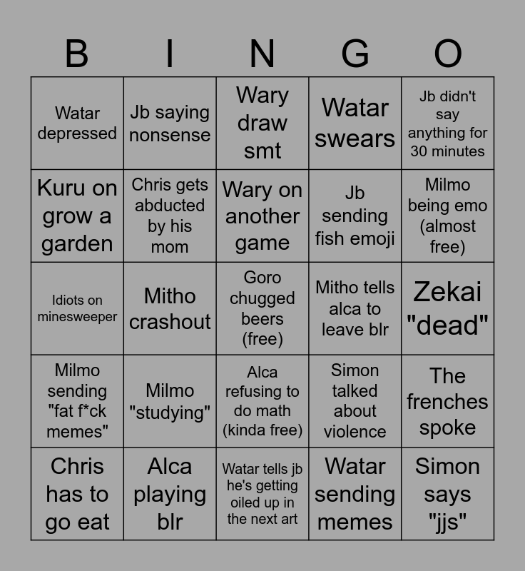This bingo card has a free space and 24 words: Milmo "studying", Alca playing blr, Wary on another game, Chris has to go eat, Jb didn't say anything for 30 minutes, Watar depressed, Kuru on grow a garden, Jb saying nonsense, Mitho tells alca to leave blr, Alca refusing to do math (kinda free), Jb sending fish emoji, Idiots on minesweeper, Simon talked about violence, The frenches spoke, Chris gets abducted by his mom, Watar sending memes, Zekai "dead", Wary draw smt, Milmo being emo (almost free), Mitho crashout, Simon says "jjs", Milmo sending "fat f*ck memes", Watar swears and Watar tells jb he's getting oiled up in the next art.