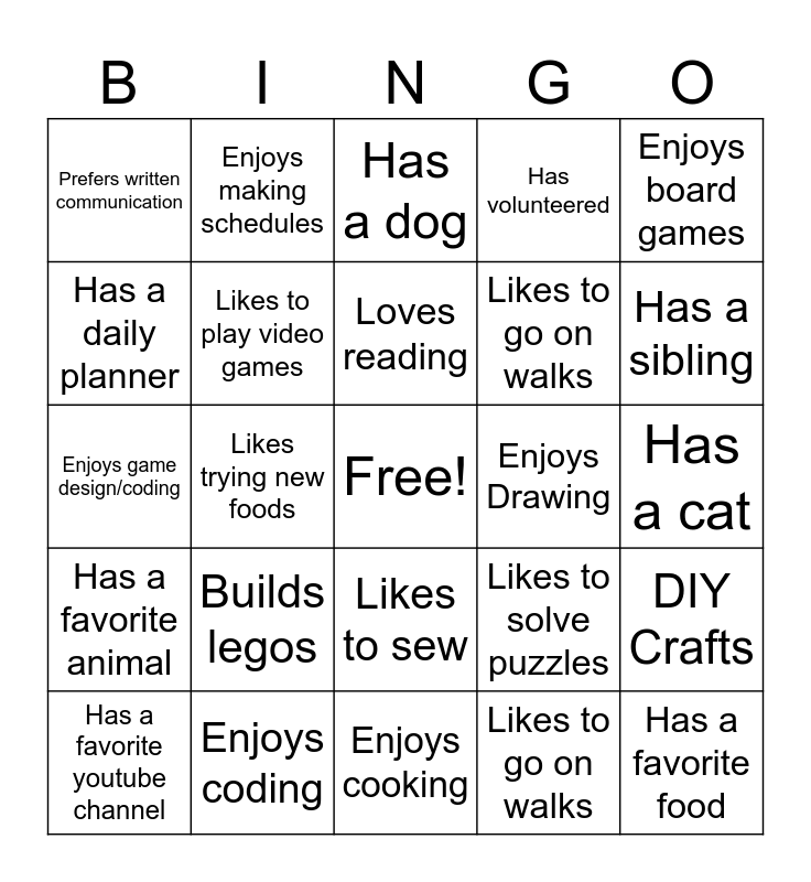 This bingo card has a free space and 24 words: Builds legos, Enjoys coding, Loves reading, Has a favorite youtube channel, Enjoys board games, Prefers written communication, Has a daily planner, Enjoys making schedules, Enjoys Drawing, Likes to sew, Likes to go on walks, Enjoys game design/coding, Likes to solve puzzles, DIY Crafts, Likes to play video games, Likes to go on walks, Has a cat, Has a dog, Has a sibling, Likes trying new foods, Has a favorite food, Has a favorite animal, Has volunteered and Enjoys cooking.