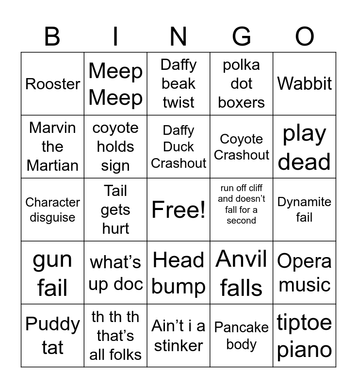 This bingo card has a free space and 24 words: what’s up doc, th th th that’s all folks, Daffy Duck Crashout, Puddy tat, Wabbit, Rooster, Marvin the Martian, Meep Meep, run off cliff and doesn’t fall for a second, Head bump, Coyote Crashout, Character disguise, Anvil falls, Opera music, coyote holds sign, Pancake body, Dynamite fail, Daffy beak twist, play dead, Tail gets hurt, tiptoe piano, gun fail, polka dot boxers and Ain’t i a stinker.