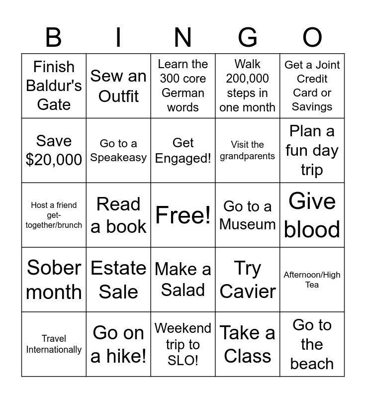 This bingo card has a free space and 24 words: Estate Sale, Go on a hike!, Get Engaged!, Travel Internationally, Get a Joint Credit Card or Savings, Finish Baldur's Gate, Save $20,000, Sew an Outfit, Go to a Museum, Make a Salad, Visit the grandparents, Host a friend get-together/brunch, Try Cavier, Afternoon/High Tea, Go to a Speakeasy, Take a Class, Give blood, Learn the 300 core German words, Plan a fun day trip, Read a book, Go to the beach, Sober month, Walk 200,000 steps in one month and Weekend trip to SLO!.