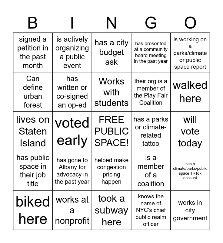This bingo card has a free space and 29 words: biked here, volunteers in a park or community garden, voted early, has testified at a city council hearing, signed a petition in the past month, has a city budget ask, has written or co-signed an op-ed, has gone to Albany for advocacy in the past year, has a parks or climate-related tattoo, works at a nonprofit, will vote today, works in city government, took a subway here, knows the name of NYC's chief public realm officer, walked here, took a ferry in the past month, helped make congestion pricing happen, has public space in their job title, is working on a parks/climate or public space report, lives on Staten Island, is a member of a coalition, works in resiliency, their org is a member of the Play Fair Coalition, Can define urban forest, has presented at a community board meeting in the past year, is actively organizing a public event, has a climate/parks/public space TikTok account, Works with students and works in the Bronx.