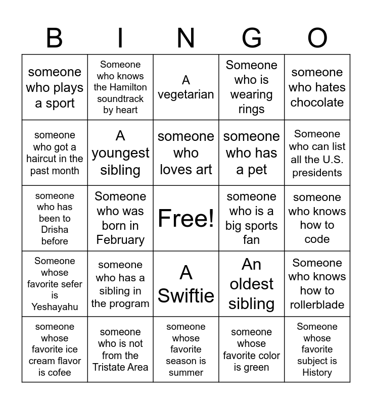 This bingo card has a free space and 24 words: someone who has a sibling in the program, someone who is not from the Tristate Area, someone who loves art, someone whose favorite ice cream flavor is cofee, someone who hates chocolate, someone who plays a sport, someone who got a haircut in the past month, Someone who knows the Hamilton soundtrack by heart, someone who is a big sports fan, A Swiftie, someone who has a pet, someone who has been to Drisha before, An oldest sibling, Someone who knows how to rollerblade, A youngest sibling, someone whose favorite color is green, someone who knows how to code, A vegetarian, Someone who can list all the U.S. presidents, Someone who was born in February, Someone whose favorite subject is History, Someone whose favorite sefer is Yeshayahu, Someone who is wearing rings and someone whose favorite season is summer.