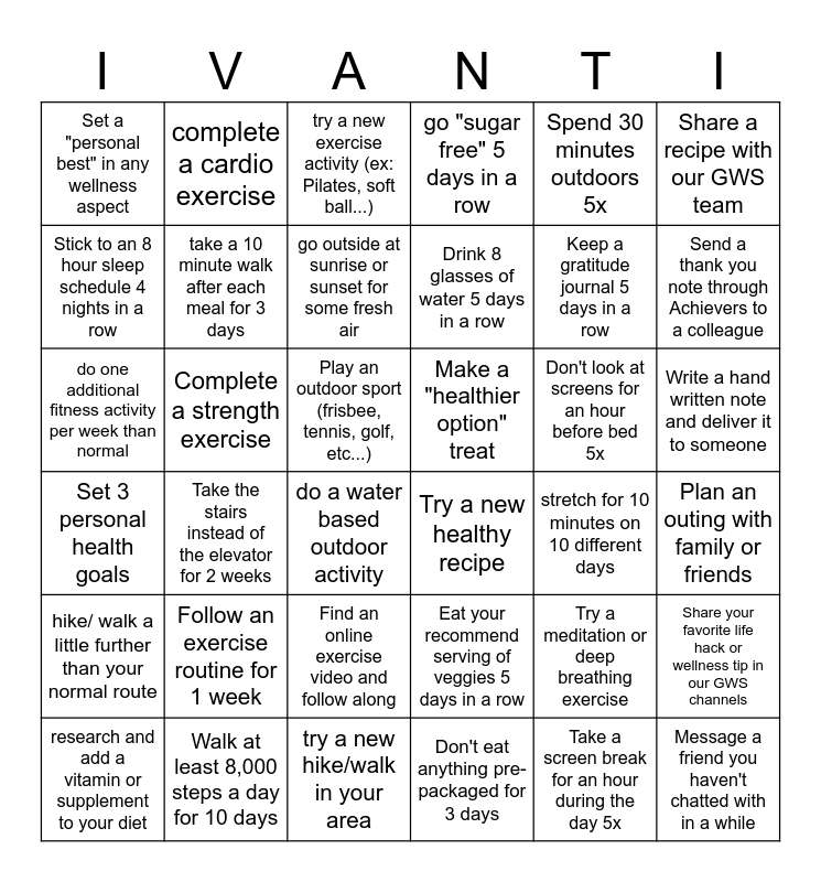 This bingo card has 36 words: Set 3 personal health goals, Take the stairs instead of the elevator for 2 weeks, try a new hike/walk in your area, Drink 8 glasses of water 5 days in a row, Don't look at screens for an hour before bed 5x, Write a hand written note and deliver it to someone, Set a "personal best" in any wellness aspect, Walk at least 8,000 steps a day for 10 days, try a new exercise activity (ex: Pilates, soft ball...), Eat your recommend serving of veggies 5 days in a row, Keep a gratitude journal 5 days in a row, Share a recipe with our GWS team, hike/ walk a little further than your normal route, Complete a strength exercise, go outside at sunrise or sunset for some fresh air, go "sugar free" 5 days in a row, Try a meditation or deep breathing exercise, Plan an outing with family or friends, Stick to an 8 hour sleep schedule 4 nights in a row, take a 10 minute walk after each meal for 3 days, do a water based outdoor activity, Try a new healthy recipe, stretch for 10 minutes on 10 different days, Share your favorite life hack or wellness tip in our GWS channels, do one additional fitness activity per week than normal, complete a cardio exercise, Play an outdoor sport (frisbee, tennis, golf, etc...), Don't eat anything pre-packaged for 3 days, Spend 30 minutes outdoors 5x, Send a thank you note through Achievers to a colleague, research and add a vitamin or supplement to your diet, Follow an exercise routine for 1 week, Find an online exercise video and follow along, Make a "healthier option" treat, Take a screen break for an hour during the day 5x and Message a friend you haven't chatted with in a while.