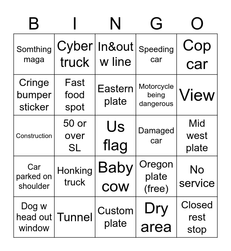 This bingo card has 25 words: Honking truck, Custom plate, Eastern plate, Dog w head out window, Cop car, Somthing maga, Cringe bumper sticker, Cyber truck, Damaged car, Baby cow, Motorcycle being dangerous, Construction, Oregon plate (free), No service, Fast food spot, Closed rest stop, Mid west plate, In&out w line, View, 50 or over SL, Us flag, Tunnel, Car parked on shoulder, Speeding car and Dry area.