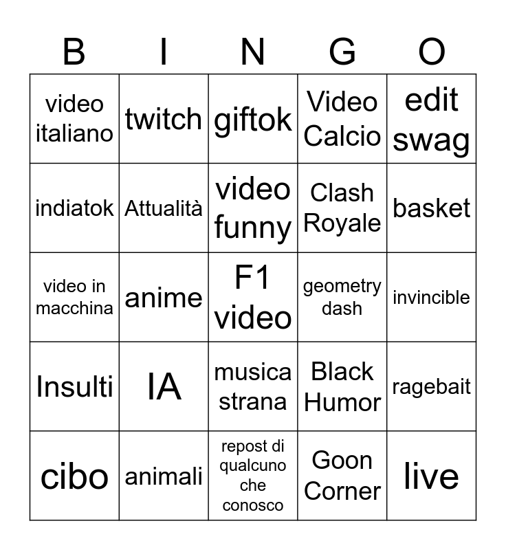 This bingo card has a free space and 24 words: IA, animali, video funny, cibo, edit swag, video italiano, indiatok, twitch, geometry dash, musica strana, Clash Royale, video in macchina, Black Humor, ragebait, Attualità, Goon Corner, invincible, giftok, basket, anime, live, Insulti, Video Calcio and repost di qualcuno che conosco.