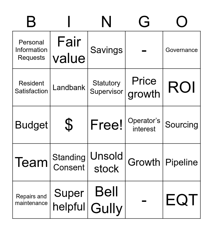 This bingo card has a free space and 25 words: Standing Consent, Bell Gully, Statutory Supervisor, Repairs and maintenance, Governance, Personal Information Requests, Resident Satisfaction, Fair value, Operator’s interest, Unsold stock, Price growth, Budget, Growth, Pipeline, Landbank, Realise the Benefits, Sourcing, Savings, ROI, $, EQT, Super helpful, Team, - and -.