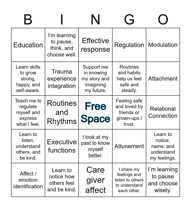 This bingo card has a free space and 31 words: Care giver affect, Engagement, Routines and Rhythms, Self- development and identity, Education, Effective response, Trauma experience integration, Attunement, Feeling safe and loved by friends or grown-ups I trust., I share my feelings and listen to others to understand each other., Relational Connection, I’m learning to pause and choose wisely., Help your caregivers manage their feelings., Competency, Attachment, Help me understand my feelings and see how strong I am., Learn to notice, name, and understand my feelings., Executive functions, Learn to listen, understand others, and be kind., I look at my past to know myself better., Modulation, Help me belong, decide, team up, share, and grow., Affect / emotion identification, I’m learning to pause, think, and choose well., Routines and habits help us feel safe and steady., Learn skills to grow strong, happy, and self-aware., Regulation, Teach me to regulate myself and express what I feel., Learn to notice how others feel and be kind., Support me in knowing my story and imagining my future. and Help caregivers respond with kindness and fairness..