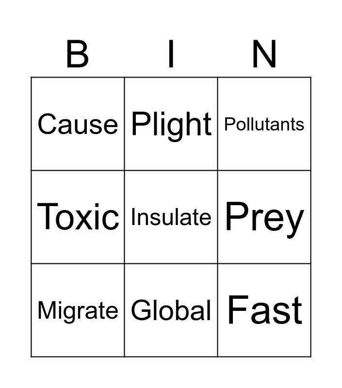This bingo card has 11 words: Fast, Global, Insulate, Migrate, Plight, Pollutants, Prey, Thrive, Toxic, Cause and Effect.