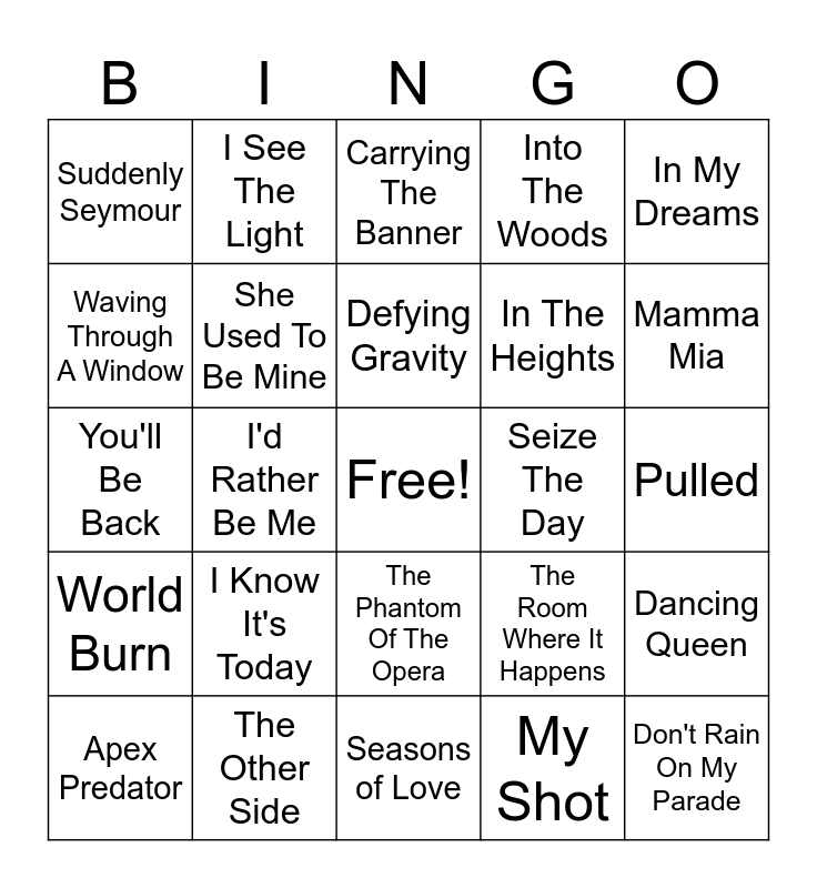 This bingo card has a free space and 40 words: Wait For Me, You'll Be Back, From Now On, She Used To Be Mine, The Other Side, The Phantom Of The Opera, Defying Gravity, In My Dreams, In My Dreams, World Burn, I'd Rather Be Me, Into The Woods, Don't Rain On My Parade, Pulled, Seize The Day, I Know It's Today, Popular, Suddenly Seymour, Watch What Happens, Carrying The Banner, Dancing Queen, My Shot, In The Heights, Waving Through A Window, What Is This Feeling?, Wait For It, Dancing Through Life, Santa Fe, Helpless, The Wizard And I, Satisfied, Apex Predator, Burn, The Room Where It Happens, Mamma Mia, Seasons of Love, You Can't Stop The Beat, For Good, I See The Light and I Just Can't Wait To Be King.
