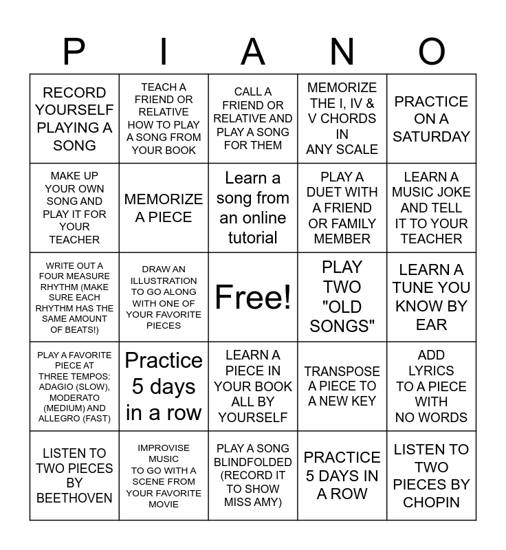 This bingo card has a free space and 24 words: Practice 5 days in a row, IMPROVISE MUSIC TO GO WITH A SCENE FROM YOUR FAVORITE MOVIE, Learn a song from an online tutorial, LISTEN TO TWO PIECES BY BEETHOVEN, PRACTICE ON A SATURDAY, RECORD YOURSELF PLAYING A SONG, MAKE UP YOUR OWN SONG AND PLAY IT FOR YOUR TEACHER, TEACH A FRIEND OR RELATIVE HOW TO PLAY A SONG FROM YOUR BOOK, PLAY TWO "OLD SONGS", LEARN A PIECE IN YOUR BOOK ALL BY YOURSELF, PLAY A DUET WITH A FRIEND OR FAMILY MEMBER, WRITE OUT A FOUR MEASURE RHYTHM (MAKE SURE EACH RHYTHM HAS THE SAME AMOUNT OF BEATS!), TRANSPOSE A PIECE TO A NEW KEY, ADD LYRICS TO A PIECE WITH NO WORDS, MEMORIZE A PIECE, PRACTICE 5 DAYS IN A ROW, LEARN A TUNE YOU KNOW BY EAR, CALL A FRIEND OR RELATIVE AND PLAY A SONG FOR THEM, LEARN A MUSIC JOKE AND TELL IT TO YOUR TEACHER, DRAW AN ILLUSTRATION TO GO ALONG WITH ONE OF YOUR FAVORITE PIECES, LISTEN TO TWO PIECES BY CHOPIN, PLAY A FAVORITE PIECE AT THREE TEMPOS: ADAGIO (SLOW), MODERATO (MEDIUM) AND ALLEGRO (FAST), MEMORIZE THE I, IV & V CHORDS IN ANY SCALE and PLAY A SONG BLINDFOLDED (RECORD IT TO SHOW MISS AMY).