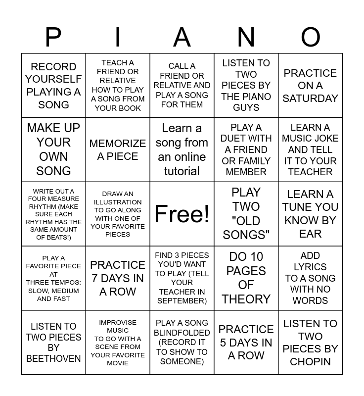 This bingo card has a free space and 24 words: PRACTICE 7 DAYS IN A ROW, IMPROVISE MUSIC TO GO WITH A SCENE FROM YOUR FAVORITE MOVIE, Learn a song from an online tutorial, LISTEN TO TWO PIECES BY BEETHOVEN, PRACTICE ON A SATURDAY, RECORD YOURSELF PLAYING A SONG, MAKE UP YOUR OWN SONG, TEACH A FRIEND OR RELATIVE HOW TO PLAY A SONG FROM YOUR BOOK, PLAY TWO "OLD SONGS", FIND 3 PIECES YOU'D WANT TO PLAY (TELL YOUR TEACHER IN SEPTEMBER), PLAY A DUET WITH A FRIEND OR FAMILY MEMBER, WRITE OUT A FOUR MEASURE RHYTHM (MAKE SURE EACH RHYTHM HAS THE SAME AMOUNT OF BEATS!), DO 10 PAGES OF THEORY, ADD LYRICS TO A SONG WITH NO WORDS, MEMORIZE A PIECE, PRACTICE 5 DAYS IN A ROW, LEARN A TUNE YOU KNOW BY EAR, CALL A FRIEND OR RELATIVE AND PLAY A SONG FOR THEM, LEARN A MUSIC JOKE AND TELL IT TO YOUR TEACHER, DRAW AN ILLUSTRATION TO GO ALONG WITH ONE OF YOUR FAVORITE PIECES, LISTEN TO TWO PIECES BY CHOPIN, PLAY A FAVORITE PIECE AT THREE TEMPOS: SLOW, MEDIUM AND FAST, LISTEN TO TWO PIECES BY THE PIANO GUYS and PLAY A SONG BLINDFOLDED (RECORD IT TO SHOW TO SOMEONE).