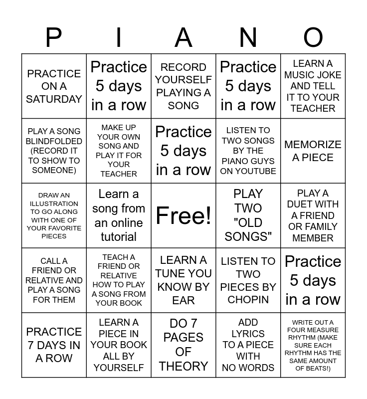 This bingo card has a free space and 29 words: PRACTICE 7 DAYS IN A ROW, IMPROVISE MUSIC TO GO WITH A SCENE FROM YOUR FAVOURITE MOVIE, Learn a song from an online tutorial, LISTEN TO TWO PIECES BY BEETHOVEN, PRACTICE ON A SATURDAY, RECORD YOURSELF PLAYING A SONG, MAKE UP YOUR OWN SONG AND PLAY IT FOR YOUR TEACHER, TEACH A FRIEND OR RELATIVE HOW TO PLAY A SONG FROM YOUR BOOK, PLAY TWO "OLD SONGS", LEARN A PIECE IN YOUR BOOK ALL BY YOURSELF, PLAY A DUET WITH A FRIEND OR FAMILY MEMBER, WRITE OUT A FOUR MEASURE RHYTHM (MAKE SURE EACH RHYTHM HAS THE SAME AMOUNT OF BEATS!), DO 7 PAGES OF THEORY, ADD LYRICS TO A PIECE WITH NO WORDS, MEMORIZE A PIECE, PRACTICE 5 DAYS IN A ROW, LEARN A TUNE YOU KNOW BY EAR, CALL A FRIEND OR RELATIVE AND PLAY A SONG FOR THEM, LEARN A MUSIC JOKE AND TELL IT TO YOUR TEACHER, DRAW AN ILLUSTRATION TO GO ALONG WITH ONE OF YOUR FAVORITE PIECES, LISTEN TO TWO PIECES BY CHOPIN, PLAY A FAVOURITE PIECE AT THREE TEMPOS: SLOW, MEDIUM AND FAST, LISTEN TO TWO SONGS BY THE PIANO GUYS ON YOUTUBE, PLAY A SONG BLINDFOLDED (RECORD IT TO SHOW TO SOMEONE), Practice 5 days in a row, Practice 5 days in a row, Practice 5 days in a row, Practice 5 days in a row and Practice 5 days in a row.