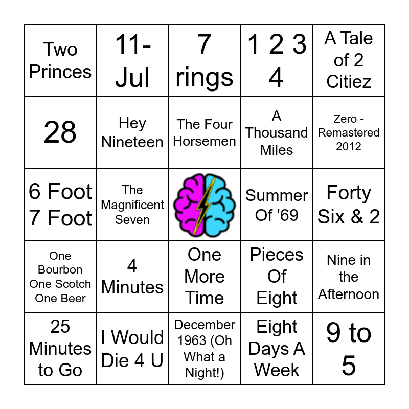 This bingo card has a free space and 47 words: I'm Gonna Be (500 Miles), 9 to 5, 24K Magic, December 1963 (Oh What a Night!), 4 Minutes, 21 Guns, 11-Jul, 1999, 28, One - Remastered, Hey Nineteen, 1 2 3 4, Nine in the Afternoon, Pieces Of Eight, Gimme Three Steps, Funk #49, The Four Horsemen, Summer Of '69, Two Out of Three Ain't Bad, A Tale of 2 Citiez, The Magnificent Seven, Eight Days A Week, Two Princes, A Thousand Miles, 1901, Zero - Remastered 2012, 25 Minutes to Go, 2 Legit 2 Quit, One More Time, One Bourbon One Scotch One Beer, ...Baby One More Time, 22, good 4 u, Like A G6, Star 69 - Remastered, I Would Die 4 U, Forty Six & 2, 1979 - Remastered 2012, Two Pina Coladas, 867-5309 / Jenny, One Way Or Another, 7 rings, 6 Foot 7 Foot, Seven Whole Days, Year 3000, 2 Phones and Five More Hours.