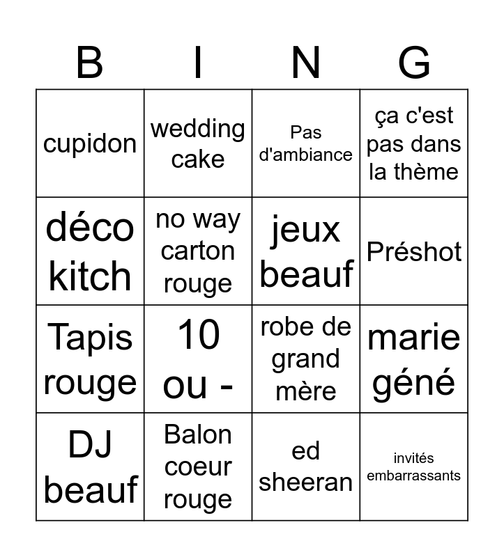 This bingo card has 16 words: Balon coeur rouge, marie géné, Pas d'ambiance, cupidon, Tapis rouge, wedding cake, robe de grand mère, ed sheeran, déco kitch, no way carton rouge, DJ beauf, ça c'est pas dans la thème, 10 ou -, Préshot, jeux beauf and invités embarrassants.