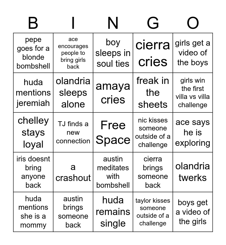 This bingo card has a free space and 24 words: a crashout, austin brings someone back, amaya cries, huda mentions she is a mommy, girls get a video of the boys, pepe goes for a blonde bombshell, huda mentions jeremiah, ace encourages people to bring girls back, nic kisses someone outside of a challenge, austin meditates with bombshell, freak in the sheets, chelley stays loyal, cierra brings someone back, olandria twerks, olandria sleeps alone, taylor kisses someone outside of a challenge, ace says he is exploring, boy sleeps in soul ties, girls win the first villa vs villa challenge, TJ finds a new connection, boys get a video of the girls, iris doesnt bring anyone back, cierra cries and huda remains single.