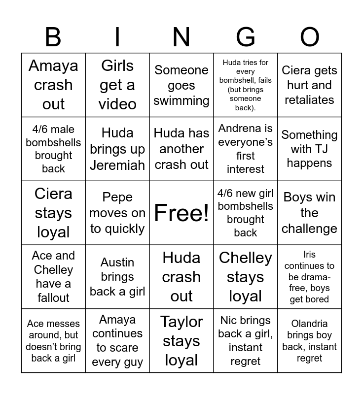 This bingo card has a free space and 24 words: Ace messes around, but doesn’t bring back a girl, Austin brings back a girl, Huda has another crash out, Nic brings back a girl, instant regret, Ciera gets hurt and retaliates, Amaya crash out, Girls get a video, Someone goes swimming, 4/6 new girl bombshells brought back, Boys win the challenge, Ciera stays loyal, Huda brings up Jeremiah, Chelley stays loyal, Iris continues to be drama-free, boys get bored, 4/6 male bombshells brought back, Amaya continues to scare every guy, Taylor stays loyal, Huda tries for every bombshell, fails (but brings someone back)., Something with TJ happens, Ace and Chelley have a fallout, Pepe moves on to quickly, Huda crash out, Andrena is everyone’s first interest and Olandria brings boy back, instant regret.