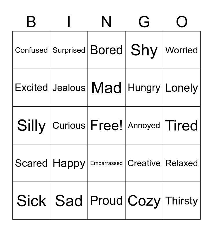 This bingo card has a free space and 24 words: Happy, Sad, Mad, Sick, Worried, Confused, Excited, Surprised, Annoyed, Embarrassed, Hungry, Silly, Creative, Relaxed, Jealous, Cozy, Tired, Bored, Lonely, Curious, Thirsty, Scared, Shy and Proud.